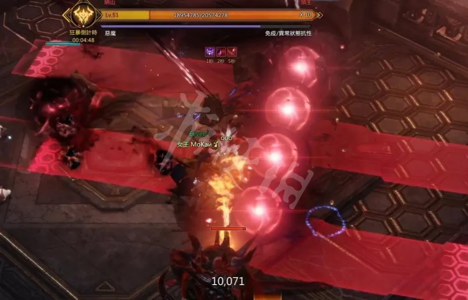13、然後剛剛的紅色球到最外面之後會回到王身上,而你的金色圈可以疊在紅色球把紅色球消除掉,需要在紅色球回到王身上之前把它消除掉如果太多紅色球回到王身上就會殺死所有人,整個過程就挺折磨的XD 打那麼久打到剩下X10條血,結果這個看似很簡單的機制有其中一個隊友吃到紅球基本上就要重新打過了。