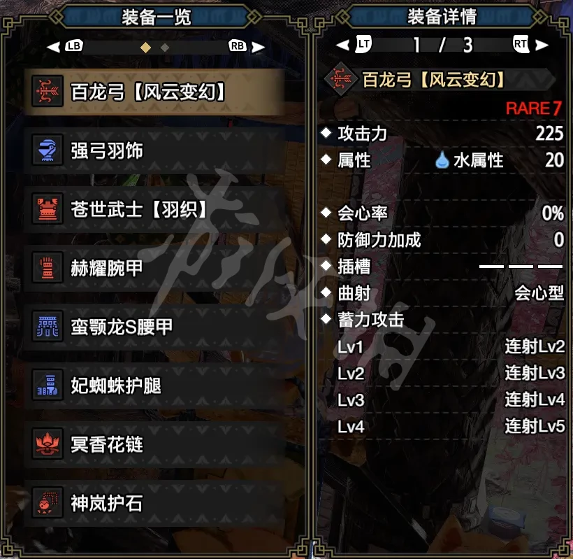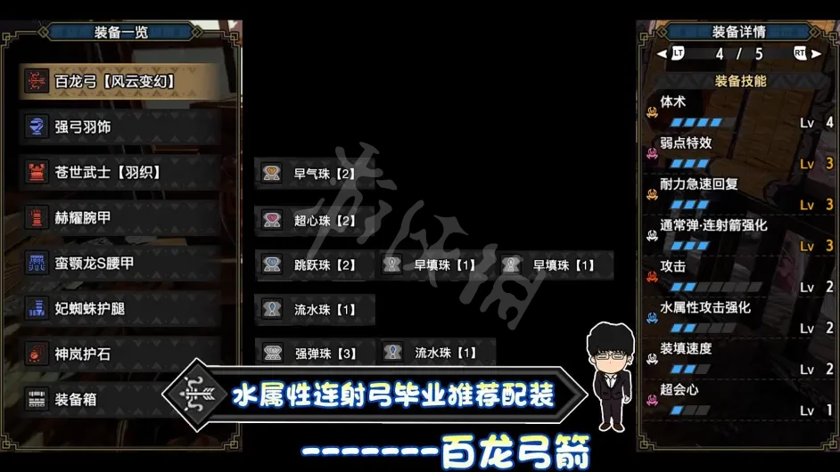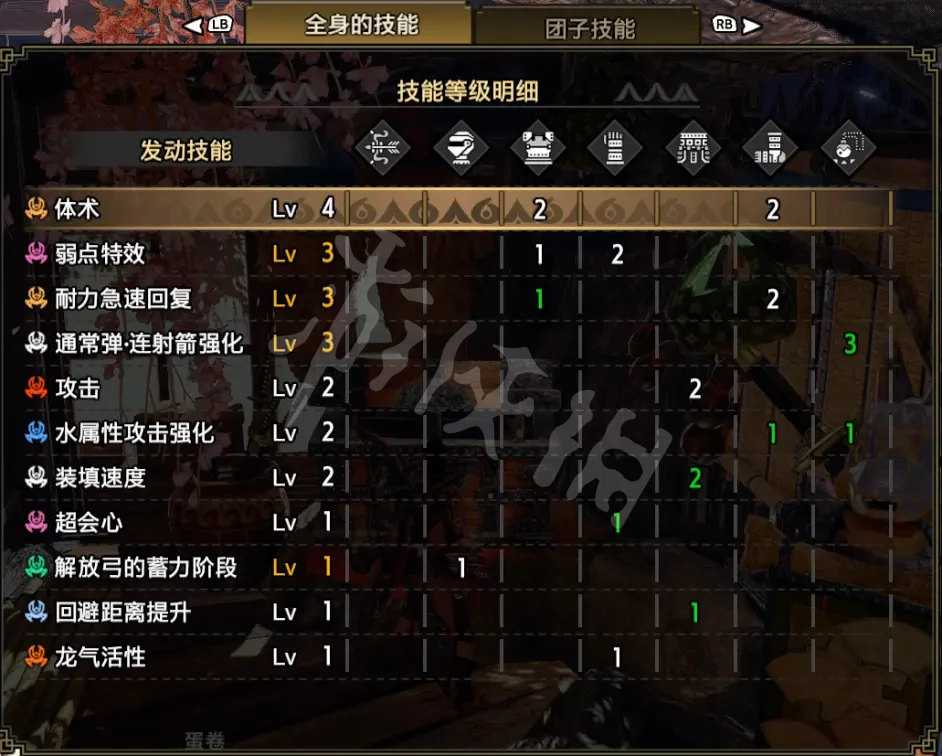 技能:體術4,弱點特效3,耐力急回3,連射3,攻擊2,水屬性2(根據自己需要去調整對應屬性),裝填2,超會心1,解放弓蓄力1,迴避距離1,龍氣活性1