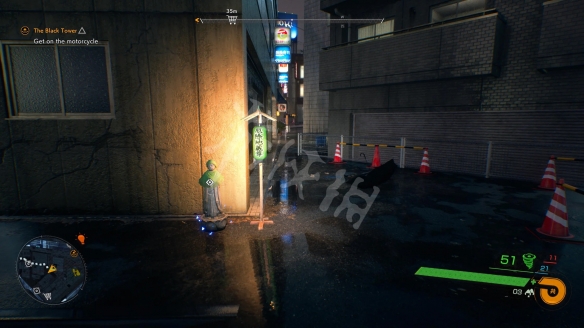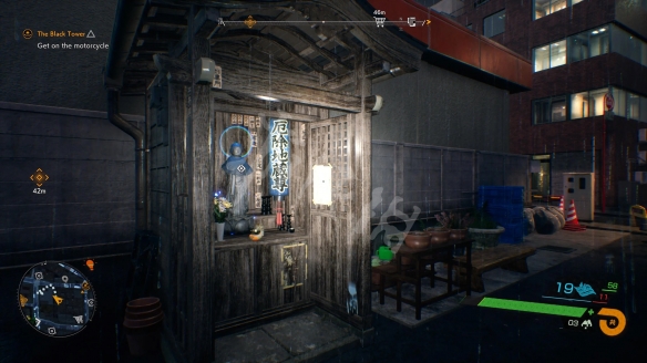 沿著神龕東側的小巷走,你會在中間發現這座雕像,旁邊是一些橙色的交通路障和自行車。