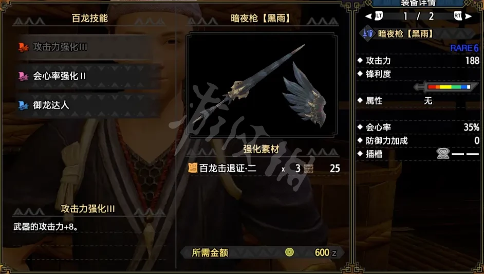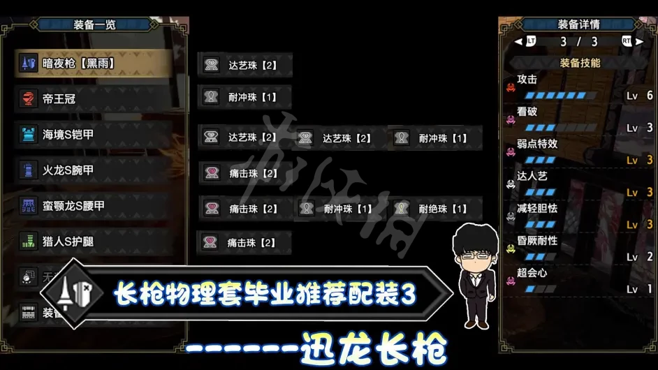 接下來說下配裝思路,配合選用的迅龍長槍相關屬性特徵,我選擇的是直接滿會心,這樣接下來只要考慮攻擊一個方向,配合達人藝的保白斬加持同樣能保證傷害收益,護石方面的話可以追求的方向也較為明顯,可選擇攻擊項相關的攻擊/超會心,也可以選擇防禦項相關的防禦性能保證生存率的提高。