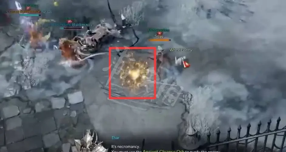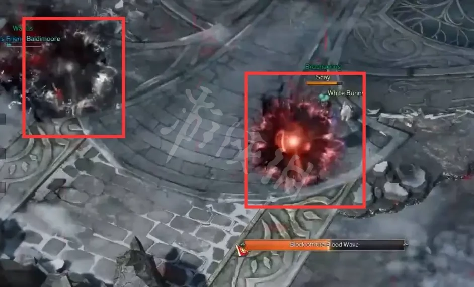 2、二號BOSS,玩家注意當隊伍中出現三名玩家被紅圈籠罩時,應盡量分散站位,避免聚集。當BOSS無敵後,將其吸引到場邊的正十字方向,站在球旁邊,引誘BOSS打球,BOSS被球的aoe炸四次以後可以破除無敵,玩家可以放心輸出。