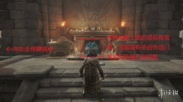 (2)四鍾樓最上面這個塔前有個寶箱,寶箱裡面有魔石劍鑰匙;並且塔旁邊就是賜福點