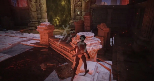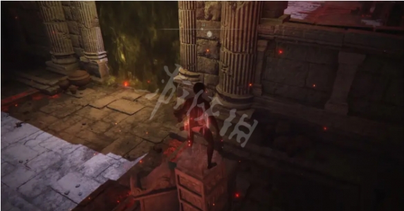 首先,我們來到蒙格王朝的BOSS房門前,從電梯右側的方向開始尋找狙擊點,我們先跳到石頭護欄上。