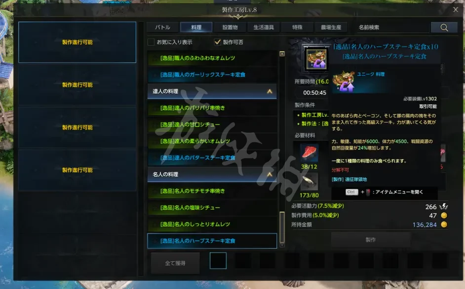 這個料理無法直接製作,需要在下圖領地NPC使用船舶派遣獲得的牌子兌換製作圖,吃完即可製作。