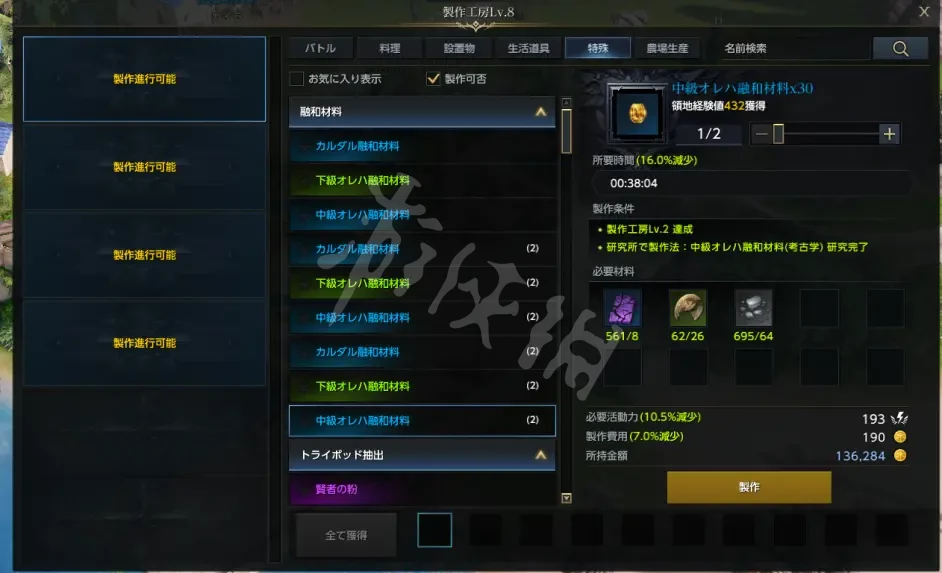 道具製作和生活掛鉤,其中比較重要的就是我們強化裝備所使用的的豆子,都是生活採集領地製作的,目前可以製作豆子的生活有釣魚、考古、狩獵。