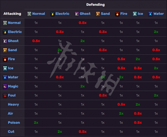 主要的科洛蒙類型也有技能類型,它們只是“攻擊”的類型(這就是為什麼圖表中只有 7 種防禦類型,而有 13 種攻擊類型),並且對標準的科洛蒙類型有自己的效果。