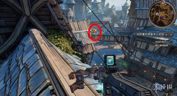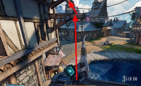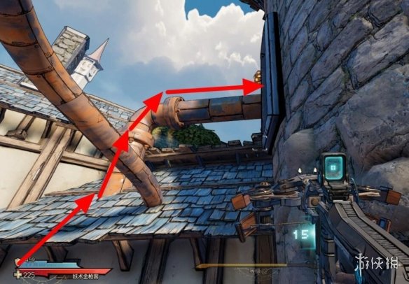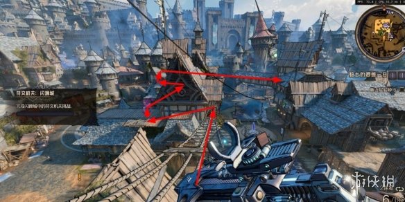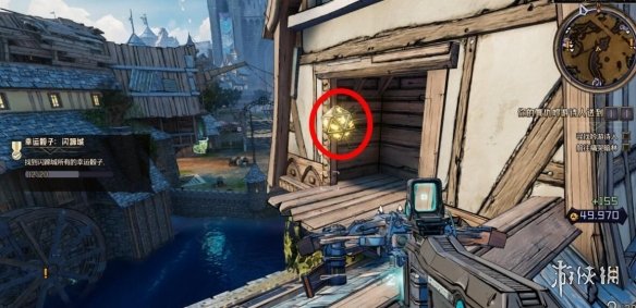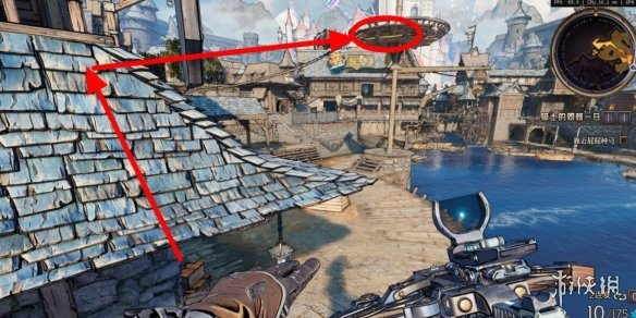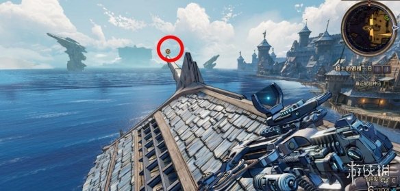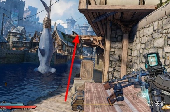 幸運骰子7:看到吊著的鯊魚,跳到對面再跳回來,在下圖的屋頂。