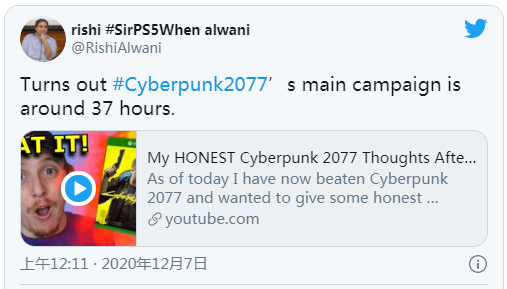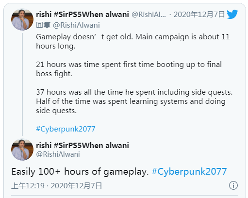 RishiAlwani表示《賽博朋克2077》主線劇情長達37個小時。從遊戲開始一直到最後的Boss戰花費了21個小時,如果再加上途中一些支線任務,總時長為37個小時(沒說完成了多少個支線任務)。RishiAlwani還表示,遊玩該作很容易就會超過100個小時。