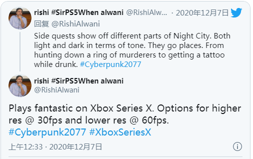 RishiAlwani表示在Xbox Series X主機上體驗《賽博朋克2077》感覺很棒,玩家可以選擇「高解析度+30FPS」或「低解析度+60FPS」。遊戲載入快,有載入畫面最多1-2秒,性能也很穩定。首日補丁能修復一些遊戲Bug。