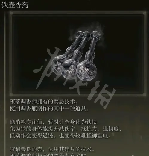 魂系列的玩家應該很熟悉,類似於黑魂里的鐵身軀,大幅度增加減傷和抵抗,但會移動緩慢翻滾困難並且雷抗性直接變負數。(測試生效時間大概15-20S左右)