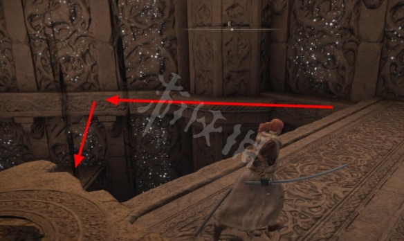 走到盡頭後轉身一層一層的跳至下方平台。在屍體上可以找到一把石劍鑰匙。