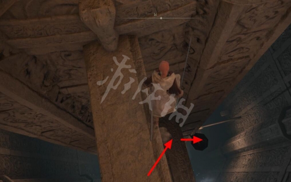 在前面跳到下方的石樑上,再次跟著石樑下落,雖然這次會掉落很高的距離但並不會摔死。