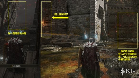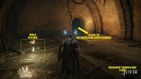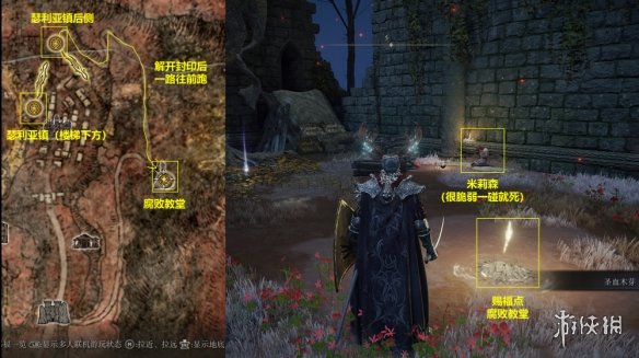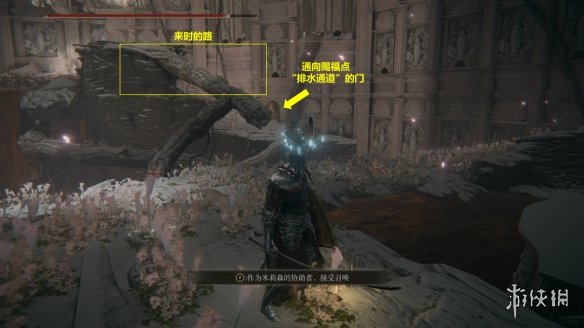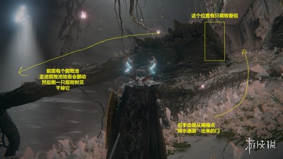 13. 繼續探索,直至找到賜福點“排水通道”。從該賜福點出發,按如圖所示的路線找到腐敗樹靈。擊敗腐敗樹靈後,可以在一旁找到米莉森的印記。接受米莉森的召喚,幫助她擊敗她的姐妹們。戰斗結束後獲得護符“腐敗劍翼徽章”。
