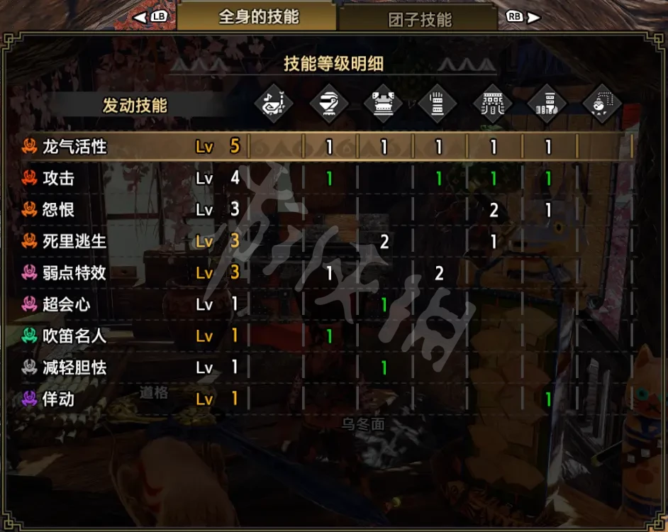 技能:龍氣活性5,攻擊4,怨恨3,死裡逃生3,弱點特效3,超會心1,吹笛名人1,減輕膽怯1,佯動1