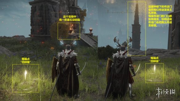 5. 前往利耶尼亞西部的四鍾樓,在最靠近山頂,也是離賜福最近的鐘樓下,開啟寶箱可以找到一把魔石劍鑰匙。通過如果所示的這道傳送門,我們可以回到出生地“侯王禮拜堂”。