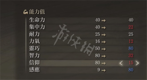 靈巧40、感應40、信仰15,其他的全點生命值。