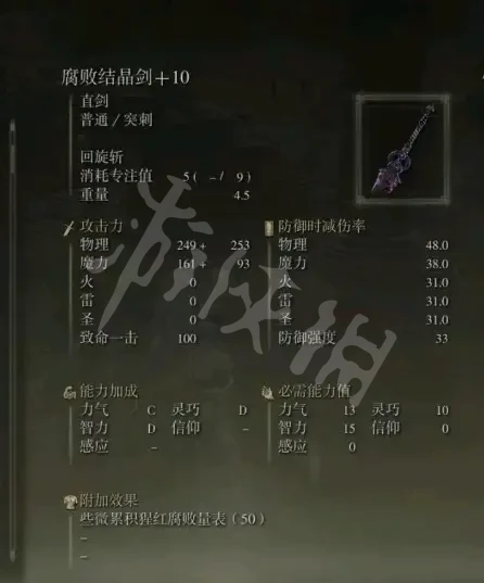 作為結晶劍的一種,面板同樣不俗,但是要低不少。但是少掉的面板換成了猩紅腐敗,自帶猩紅腐敗的武器很少,有就珍稀吧。自帶猩紅的情況下,有著依然不俗的面板,依然是推薦法師用,高面板還帶猩紅,值得一用。