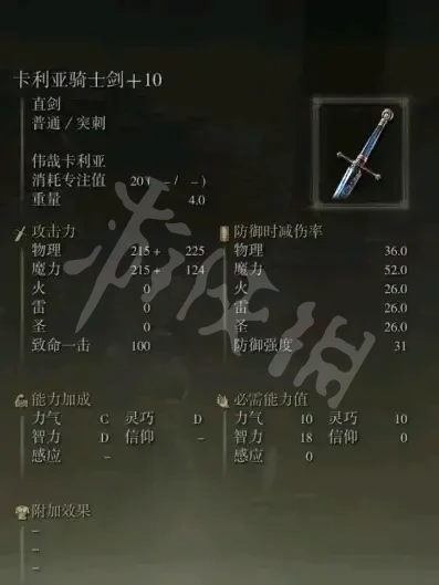 卡利亞騎士劍在諸多魔力劍中,屬於面板很高的一把,同拉茲利一樣,力敏智三項都會吃一些,也是屬於偏後期使用。戰技偉哉卡利亞說實話用處不大,可蓄力和EXcalibur一樣,但是距離並不遠,而且蓄力時間極長,目前測試中穩定的方式是帶消聲護符,摸敵人旁邊蓄滿來一發。面板是好武器,戰技是帥,帥就完事,不推薦使用。