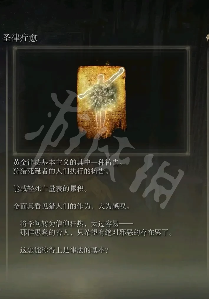 艾爾登法環聖律療愈禱告好用嗎?聖律療愈禱告可以減少死亡量表的累積,打一些特定的boss比較好用。下面小編就帶來艾爾登法環聖律療愈禱告獲取方法分享,一起來看看吧。