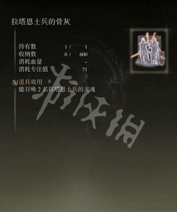 獲取方法:在英靈地下墓地女武神的幻影守護的小房間內,我們可以從屍體上獲得拉塔恩士兵的骨灰。