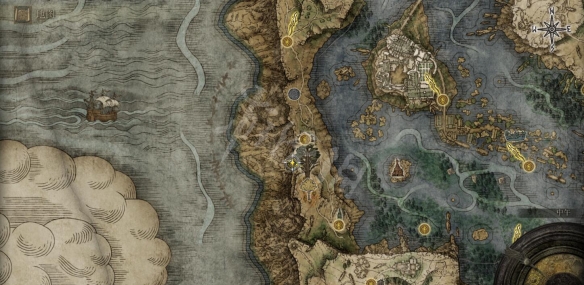 第一張圖為大地圖的大概位置,具體位置在上面小黃金樹BOSS那層,繞下來到懸崖邊上會看到個石像,跟著藍色指引光一直往下走就到了。