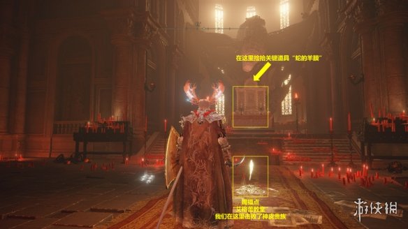 10. 探索小鎮,直至打敗BOSS神皮貴族,在它身後的祭壇上獲得關鍵道具“蛇的羊膜”。返回澤菈雅絲處和其對話,並把蛇的羊膜交給她,繼續對話至復讀。在賜福處休息刷新地圖,澤菈雅絲將離開火山官邸的房間。