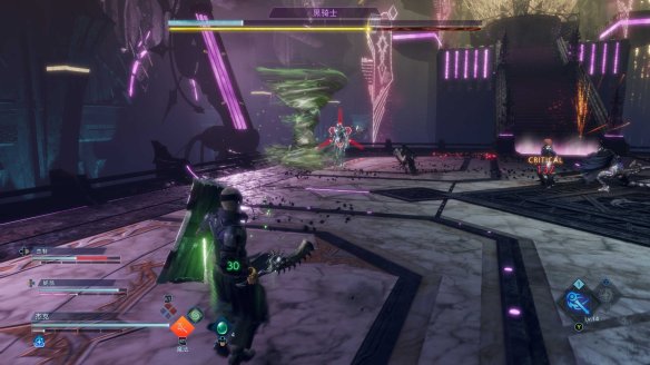 第二階段黑騎士進入步行狀態,此時他會使用一些魔法攻擊相對更難纏一些,其中龍卷風在一定範圍內具有吸引力,要及時跑出其覆蓋的範圍。