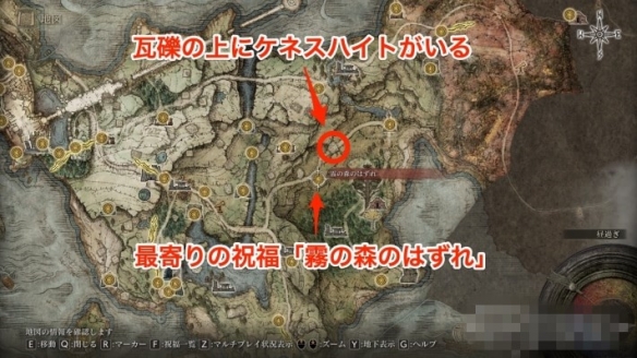 (下圖中紅色標記位置自上至下依次為肯尼斯·海德的位置和賜福點霧林邊緣位置)