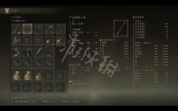 測試周目是一周目,首先我的面板是主攻靈敏的,因為前面玩的長牙太刀,可以看到就面板數值上的比較,鋒利質變的長牙已經被屍山血海完全比下去了。