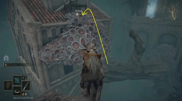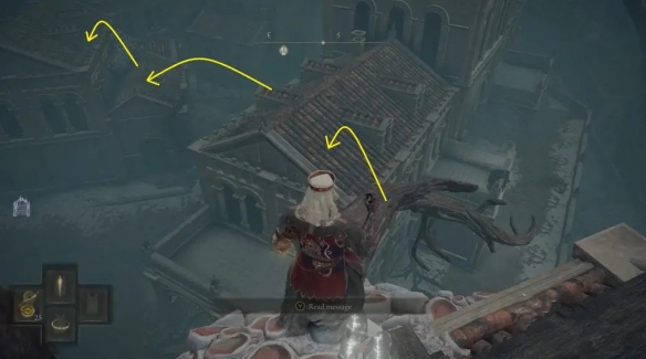 再爬樓梯下來,騎馬使用二段跳來到下邊的屋頂上,然後左拐,跳到對面的建築上。