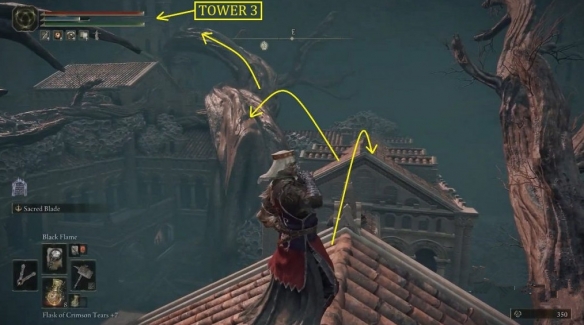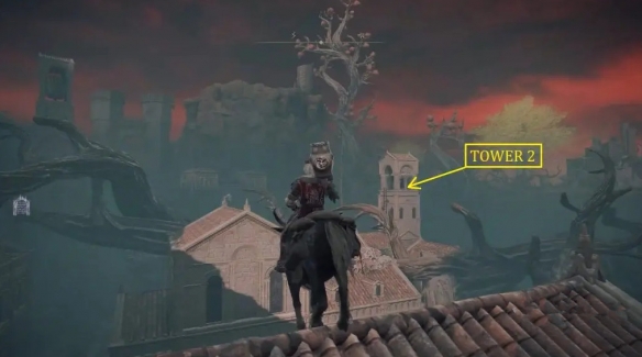 從樓梯下來,騎馬使用二段跳來到對面的屋頂上,然後再沿著左邊的樹根走,前面就是第三座塔,點燃第三個燭台後,瑟利亞鎮的封印就解開了。