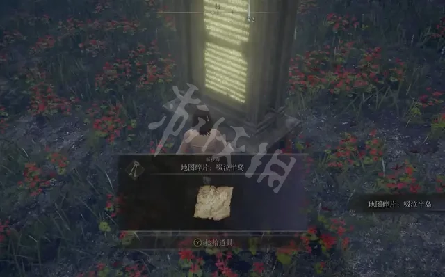 開完賜福點後就可以看到在旁邊的關卡前廢墟的一個石碑,在這個石碑我們就可以獲得我們的地圖碎片。我們後面所有的地圖碎片都會存放於這樣的一個石碑前。我就不一一解釋了。
