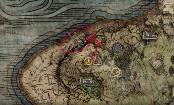 首先我們要准備馬兒,地圖在啜泣半島,賜福點叫瑪麗卡第四教堂。走法如圖所示,一共2個無傷跳躍的斷崖,不要圖省事直線從這個三角形過去,誰試誰知道。