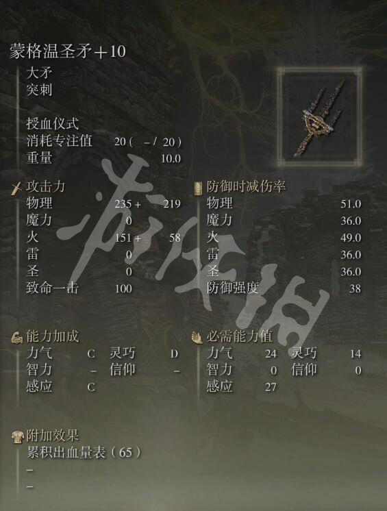 蒙格溫聖矛自帶出血,並且自帶一個很好用的戰技----授血儀式,是一個360°的大范圍AOE,只需要讀取一段,就可以給武器上血焰狀態,在施展戰技的時候會自帶霸體,並且還有超級強悍的削減韌性。