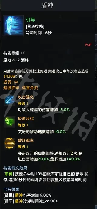 符文的話,去港口找茶於天秤商船,然後在特價銷售的第二頁有斷罪和審判符文,把斷罪放在躍擊上,審判放在盾推上,打怪的時候先用躍擊在用審判,有幾率觸發回藍效果,媽媽再也不怕我沒藍用了!然後再給爆裂炮和雷擊加個釋放速度符文就可以了,其他技能想用啥符文用啥符文,沒要求!