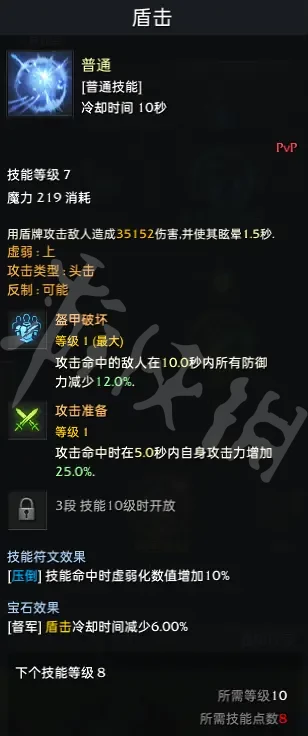 盾擊(即圖5的第一個技能)只需要點到7級然後點出加攻擊BUFF的三腳架就完全足夠了,衝擊炮(即圖5的第二個技能)用來反制boss技能,1級就夠,至於盾盪(即圖5的第三個技能),傷害一般般,圖3圖4的5個技能點滿之後,盾擊也到7級了,可以吧盾盪拉滿。