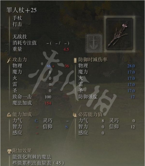 在法杖的選擇上,我想大部分玩家第一時間想到的一定是這把罪人杖,荊棘魔法加成和出血量表加成,外加S級別的智力補正,一切看起來都是那麼美好。