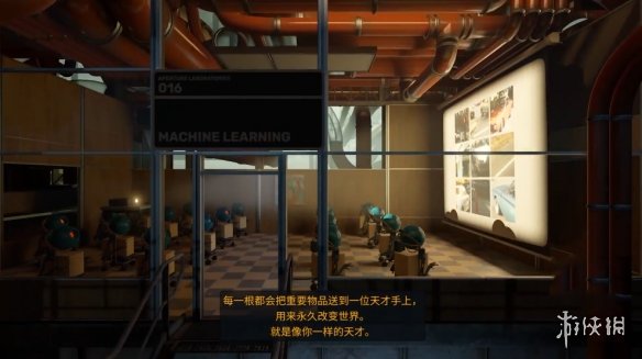 除此之外,在遊戲開頭的動畫里,和Grady一樣的機器人們在一個寫著machine learning(機器學習)的教室里上課 ,也許是表示光圈科技的人工智慧學習進化也是和人類一樣的模式?(哈哈)