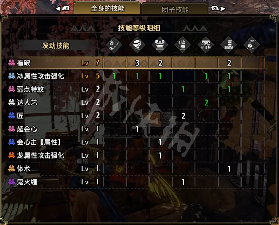 技能:看破7,冰屬性5,弱點特效2,達人藝2,匠2,超會心1,會心擊【屬性】1,龍屬性1,體術1,鬼火纏1。