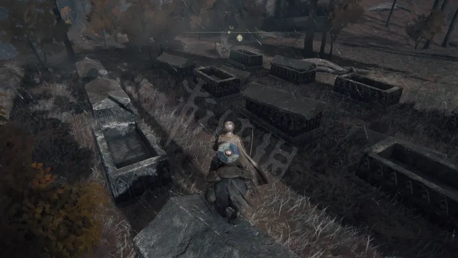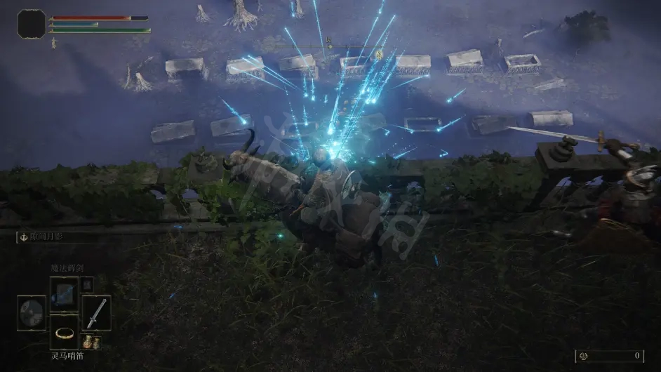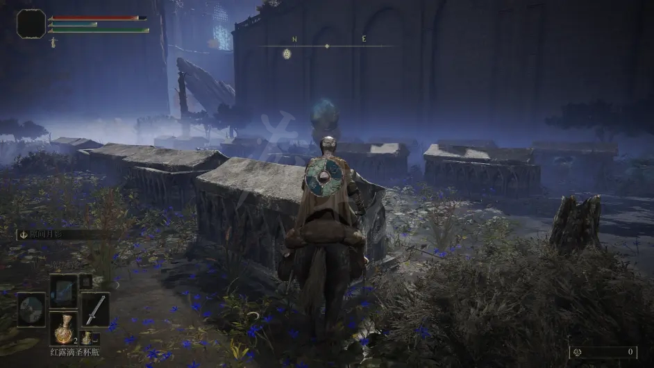 過了學院門口往回跑,貼右側走,拿藍白盾,畢竟是個順手拿到的免費無戰技盾,還是挺香的。跳下去之後貼牆會遇到一片棺材,這里有十個盧恩塊,都拿上。