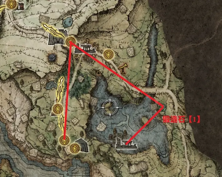 鍛造石【8】在甲蟲里頭,有點打不動的話可以逼它跳崖;鍛造石【9】在懸崖下邊;黃金盧恩【5】在旁邊有兩頭小龍的湖裡面。
