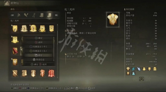 獲取方法:祈禱室出門右轉向下跳,在一個平台的小房間里有一個寶箱,寶箱里藏著化三光環。