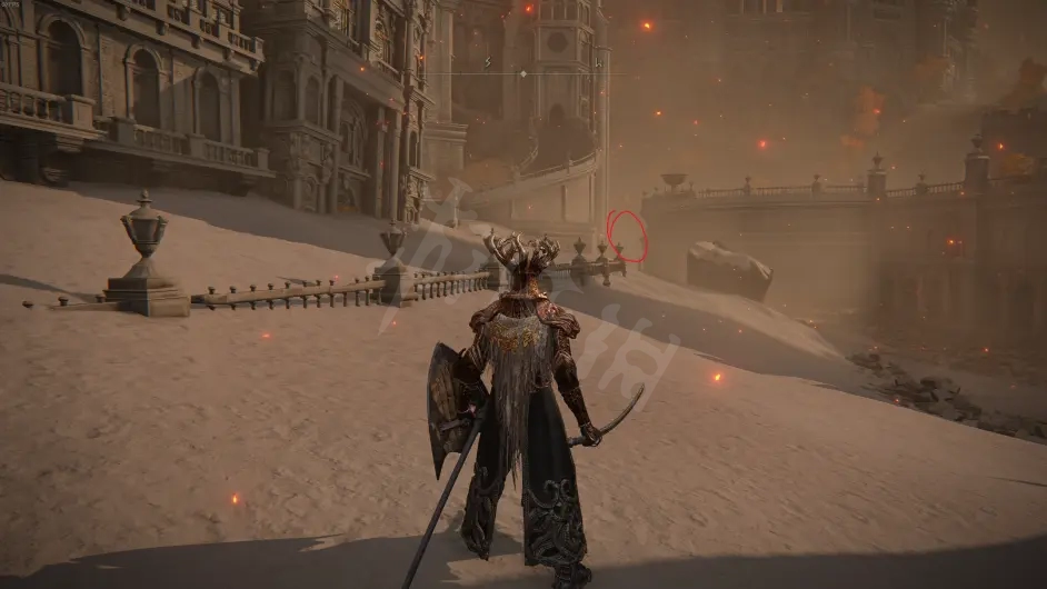 這里見過他們之後就可以放心燒樹了,在打敗風暴城最終boss黑劍之後,王城會變為灰城,在這里就可以再次見到柯林,從標記的路口前進過橋,然後左轉走一段就可以看到金面具和他的大盧恩了。