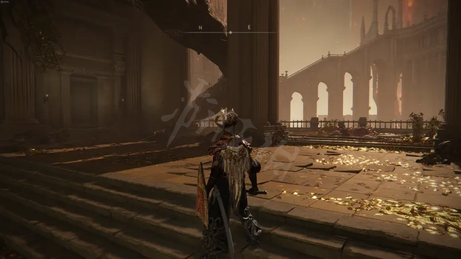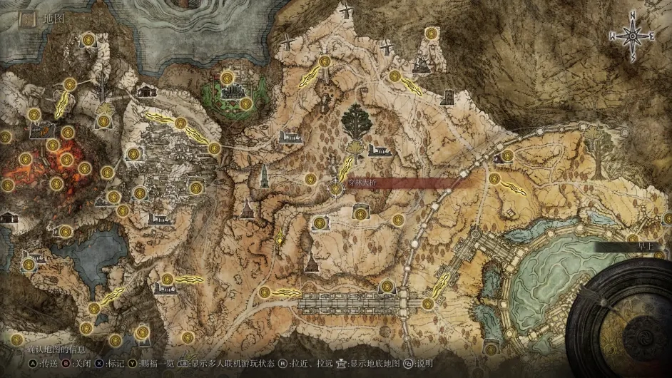 和他對話得知他在尋找金面具,金面具的位置就在穿林大橋的斷橋對面,這里我們傳送到穿林大橋賜福,乘坐旁邊的傳送門,再回頭到斷橋邊就可以看到金面具了。