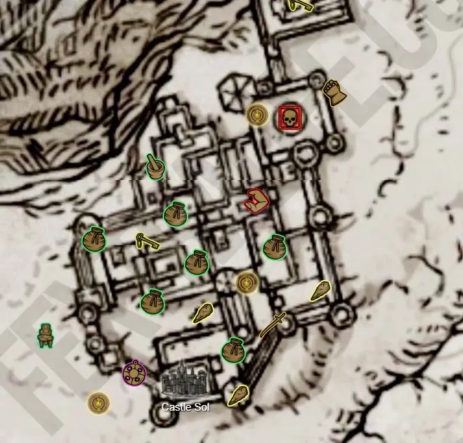 可以在莫爾尼城堡,從主庭院出發,繞道右邊的牆壁,經過燃燒的屍體,到達北樓,沿著線性路徑到達頂層。該物品在絞刑架旁邊的屍體上。