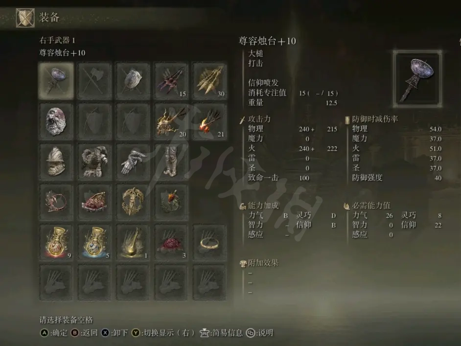 信仰觸媒選的也是雙B加成的爪痕,但是信仰80以後爪痕就不如黃金樹了,如果是超水桶號智力也很高的話,建議換成黃金律法印記。