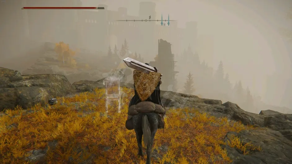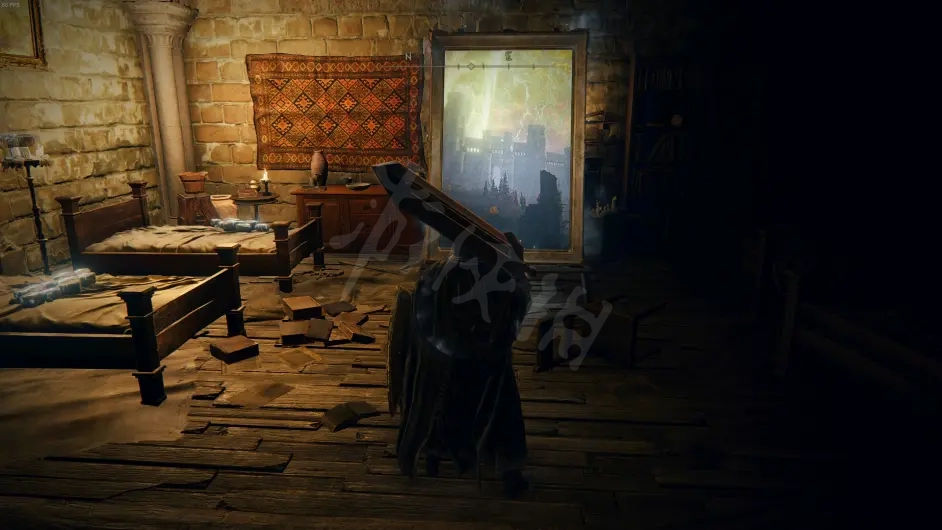 畫中是王城城牆城門、黃金樹和一個廢墟,畫中城門沒有雕像,可以判斷是北側城門,結合廢墟的位置,可以找到風車村東南側懸崖,到達如圖位置,可以找到畫家以及獎勵禱告:火焰重罪。