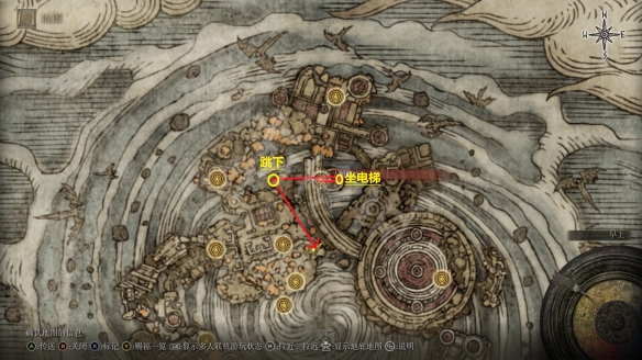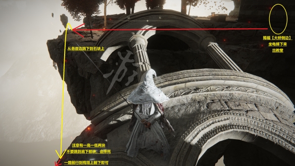 從“大橋側邊”的賜福坐電梯往回走,出教堂後在懸崖邊上找石頭往下跳。