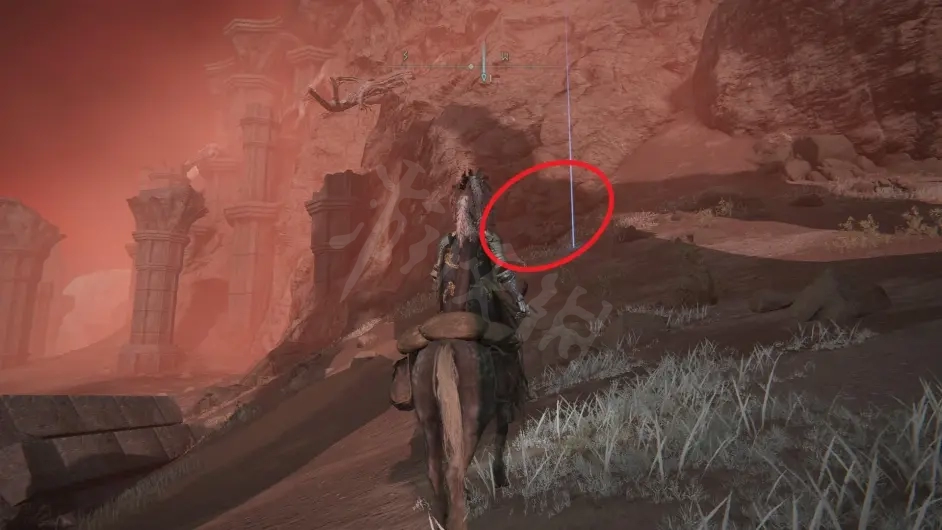 第二步:那裡的具體地貌如上圖所示,緊接著我們就去找拉塔恩,過去後直接接近他,不要招惹npc。當拉塔恩從射箭模式變成近戰模式的時候,玩家騎馬遛他並向剛剛標記的位置移動。記住:我們需要和拉塔恩保持恰當的距離,如果距離太遠,拉塔恩又會變成射箭模式。