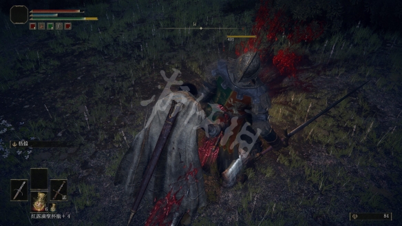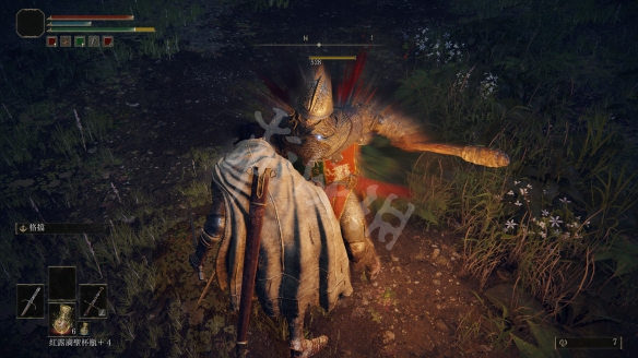 附圖為被我用戰技格擋後兩腿癱軟的敵人。此時靠近他用右手輕攻擊可以觸發處決,打出大量傷害。